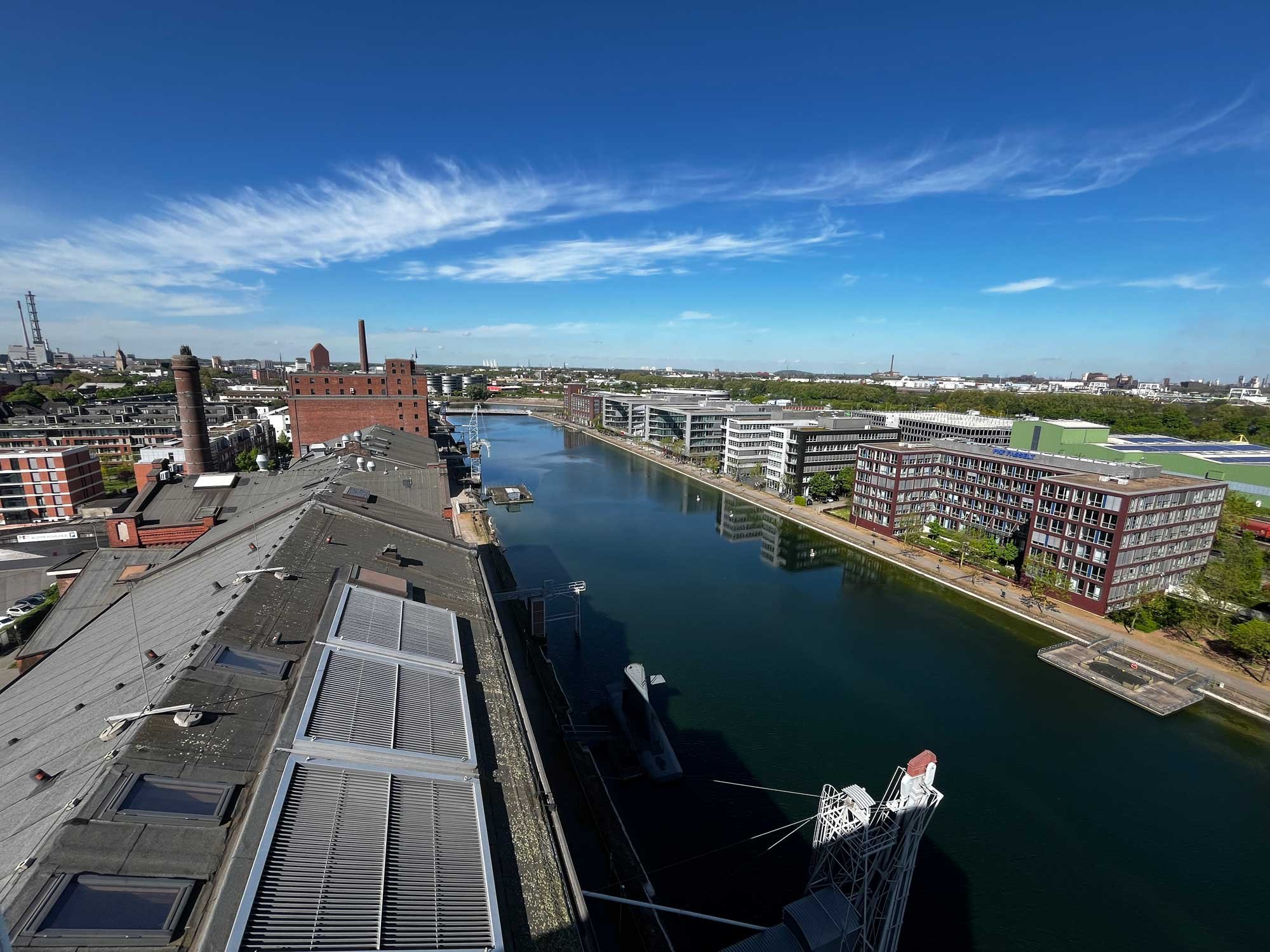 Unter optimalen Wetterbedingungen bietet die Plattform einen Panoramablick auf zahlreiche bekannte Wahrzeichen von Duisburg, darunter der Landschaftspark Nord, die Halde Rheinpreußen, die Salvatorkirche, das NRW-Landesarchiv, das Rathaus, das Stadttheater und die “Goldene Leiter”. Darüber hinaus sind der Rheinturm und die Skyline von Düsseldorf, der Stadtwald in Mülheim und der Gasometer in Oberhausen sichtbar. Die Eröffnung der Aussichtsplattform unterstreicht das Engagement des Museum Küppersmühle, außergewöhnliche Architektur und Kunst ni einem einzigartigen Rahmen zu präsentieren.