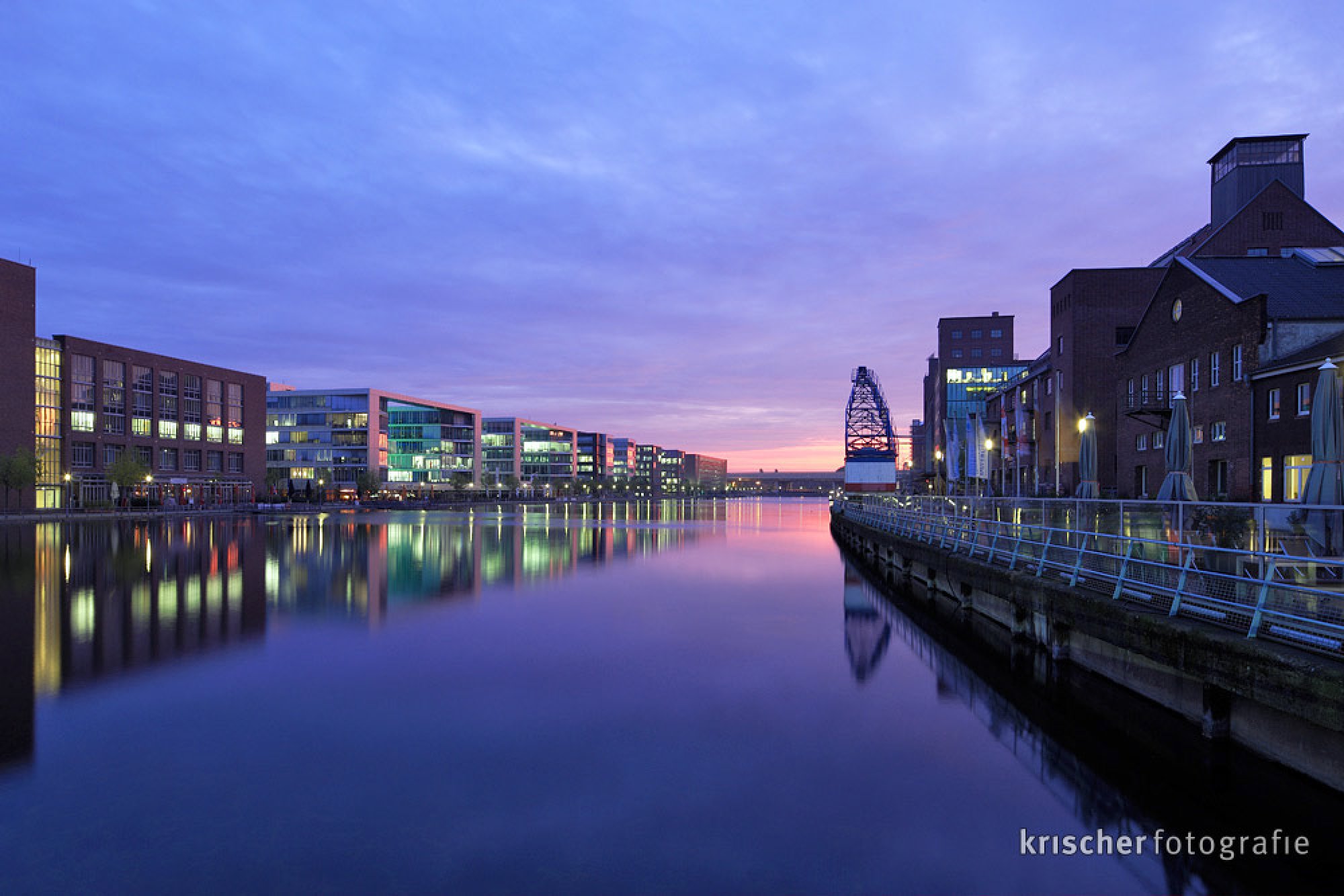 Anders als die beiden Arkaden vor der Werhahn und Küppersmühle sind die Arkaden am Hafenforum als solche nicht sofort zu erkennen, da sie mit dem normalen Gehweg verbunden und gepflastert sind. Richtig zu erkennen sind sie nur von der gegenüber liegenden Uferseite.