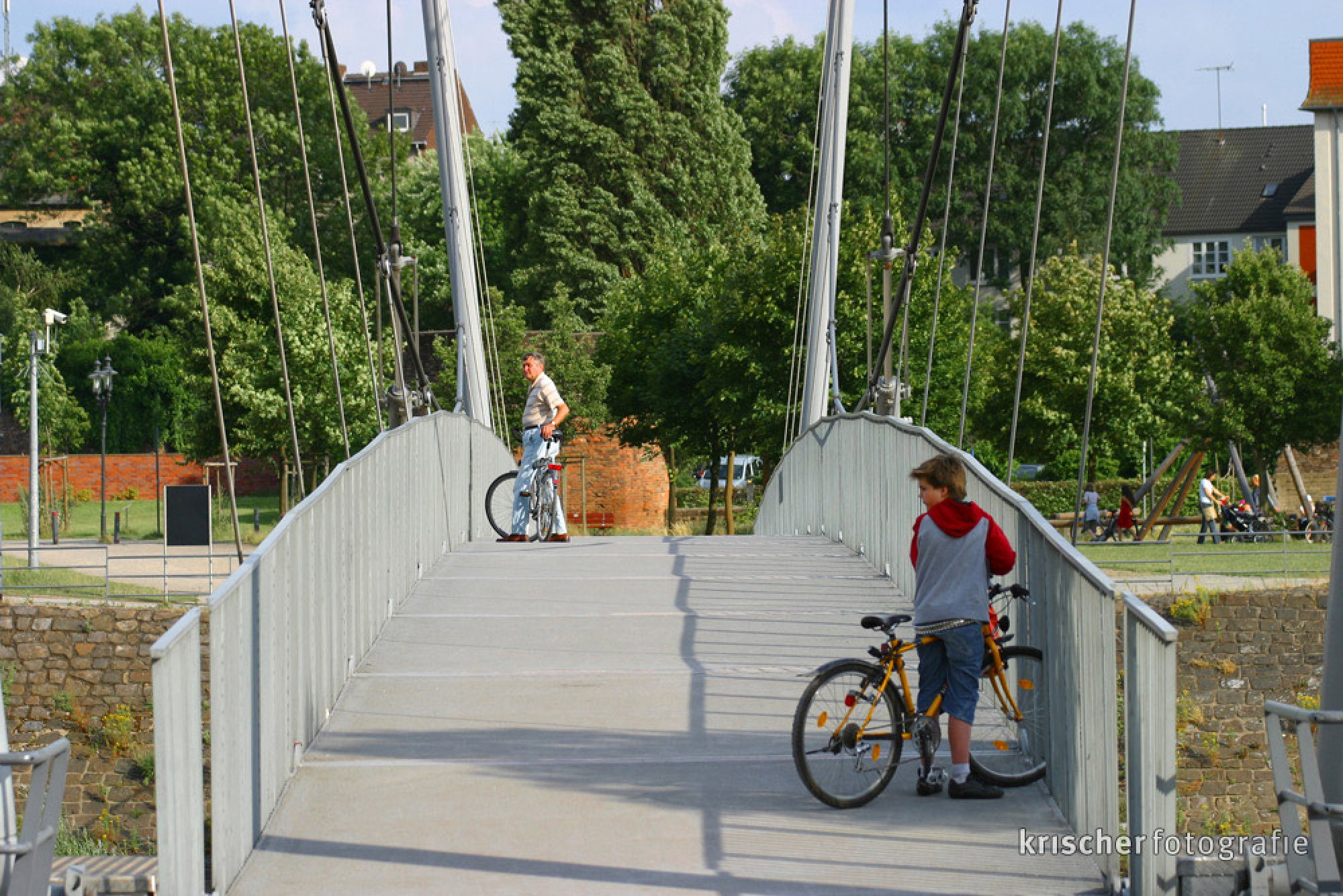 Dabei wirkt die Buckelbrücke gar nicht so wuchtig: Ihre 15 zentimeter dicken Einzelteile sind durch Gelenke beweglich miteinander verbunden – wie das Gliederarmband einer Uhr. Damit sich die Brücke krumm machen kann, um Schiffen durchfahrt zu gewähren, werden die Pylonen durch Hydraulikzylinder landeinwärts gezogen. Das Tragseil spannt sich, und die Brücke wölbt sich nach oben – bis zu neun Metern. Diesen einmaligen Mechanismus hat sich der Stuttgarter Professor Jörg Schlaich ausgedacht, die Duisburger Firma Stahlbau Raulf hat seine Idee umgesetzt. Bedient wird die Hydraulikanlage der “Buckelbrücke” vom Brückenwärter am Schwanentor.