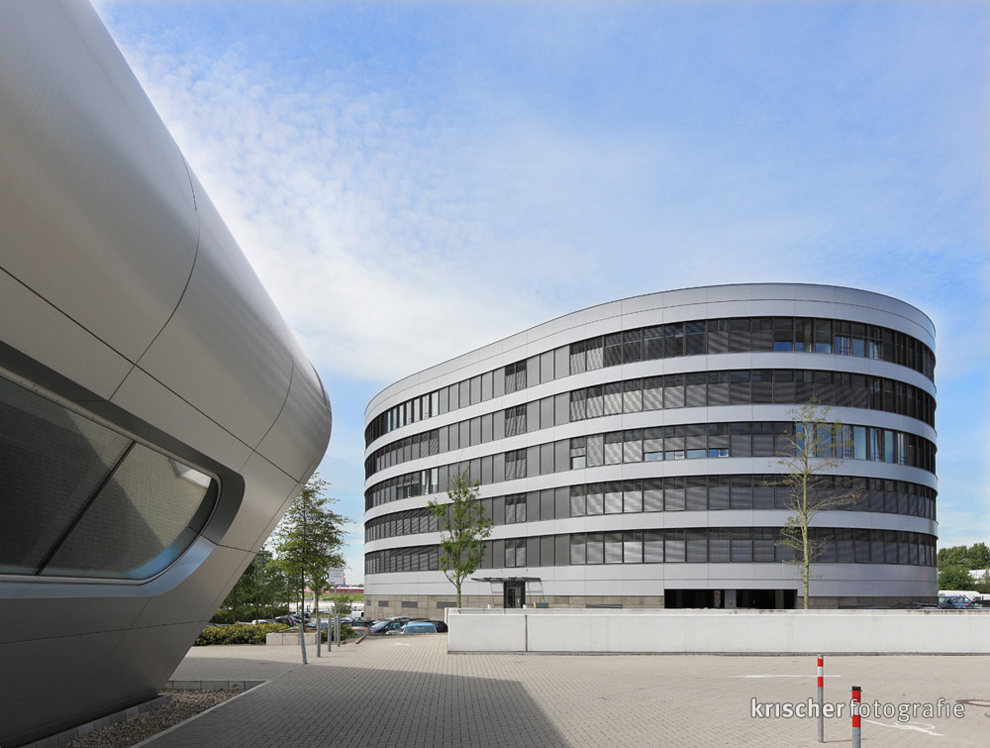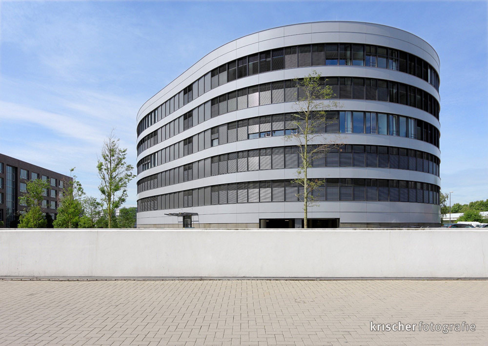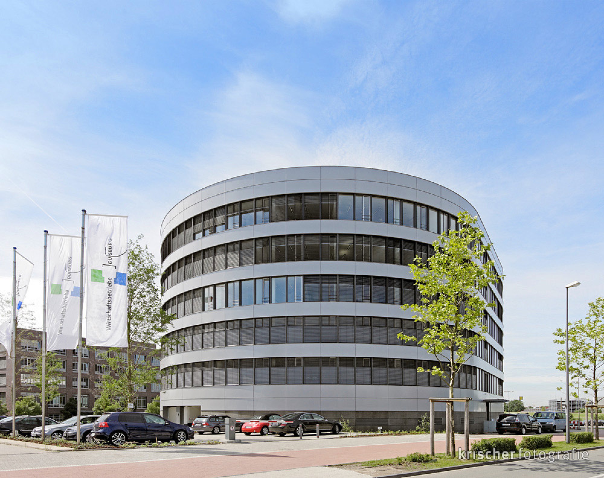 Die Büroimmobilie Looper steht direkt hinter der Hauptverwaltung der Volksbank Rhein-Ruhr. Der ovale Gebäudekomplex umfasst knapp 16.000 Quadratmeter BGF.